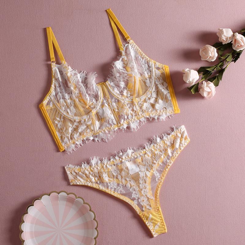 Zmysłowy biały komplet koronkowy z żółtymi akcentami – push-up + stringi